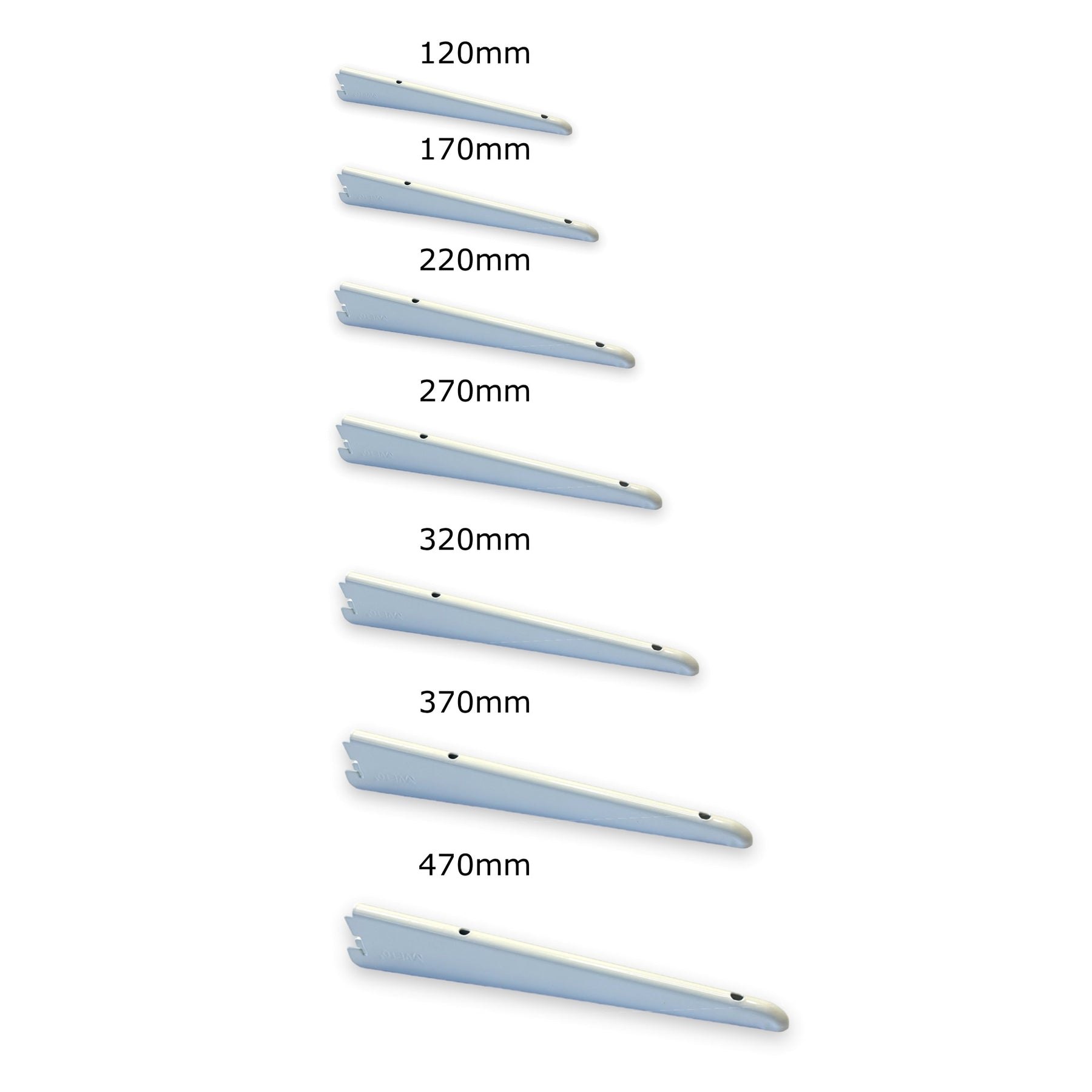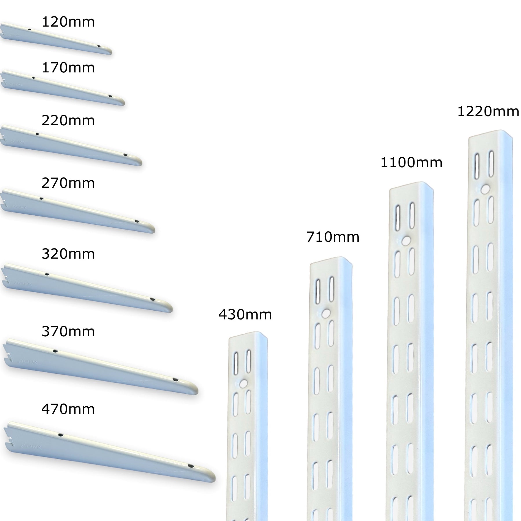 Various Upright and Bracket Sizes Available: Choose from a range of upright lengths (430mm, 710mm, 1000mm, and 1220mm) and bracket lengths (120mm, 170mm, 220mm, 270mm, 320mm, 370mm, and 470mm) to suit your specific shelving requirements.