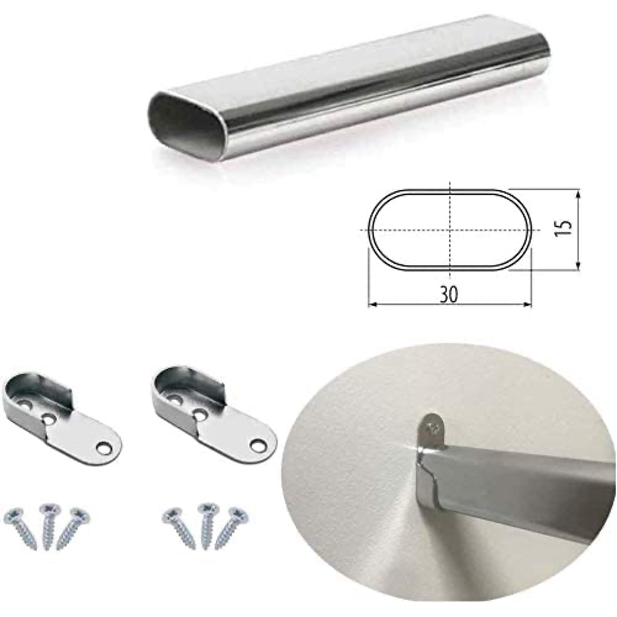 Oval Closet Rod Polished Chrome with End Supports & Screws - Customisable Metal Wardrobe Hanging Rail