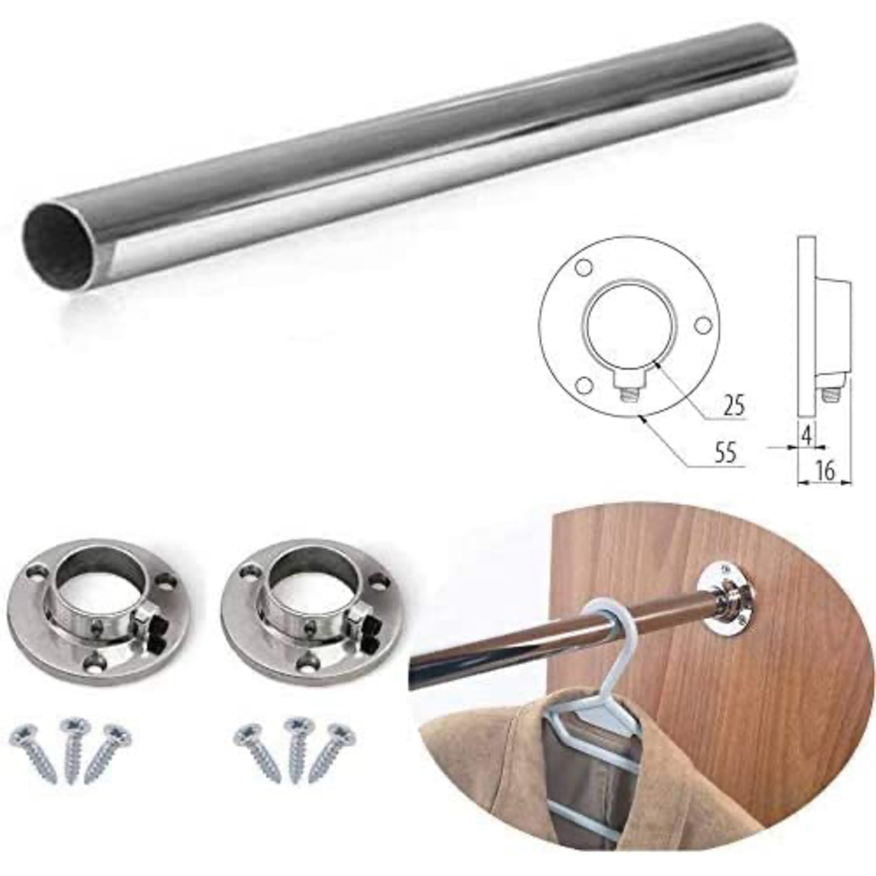 Round Closet Rod Polished Chrome with End Supports & Screws - Customisable Metal Wardrobe Hanging Rail