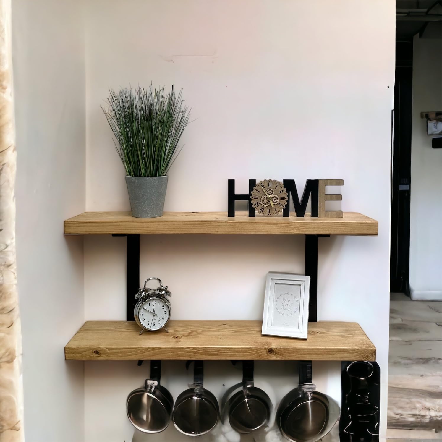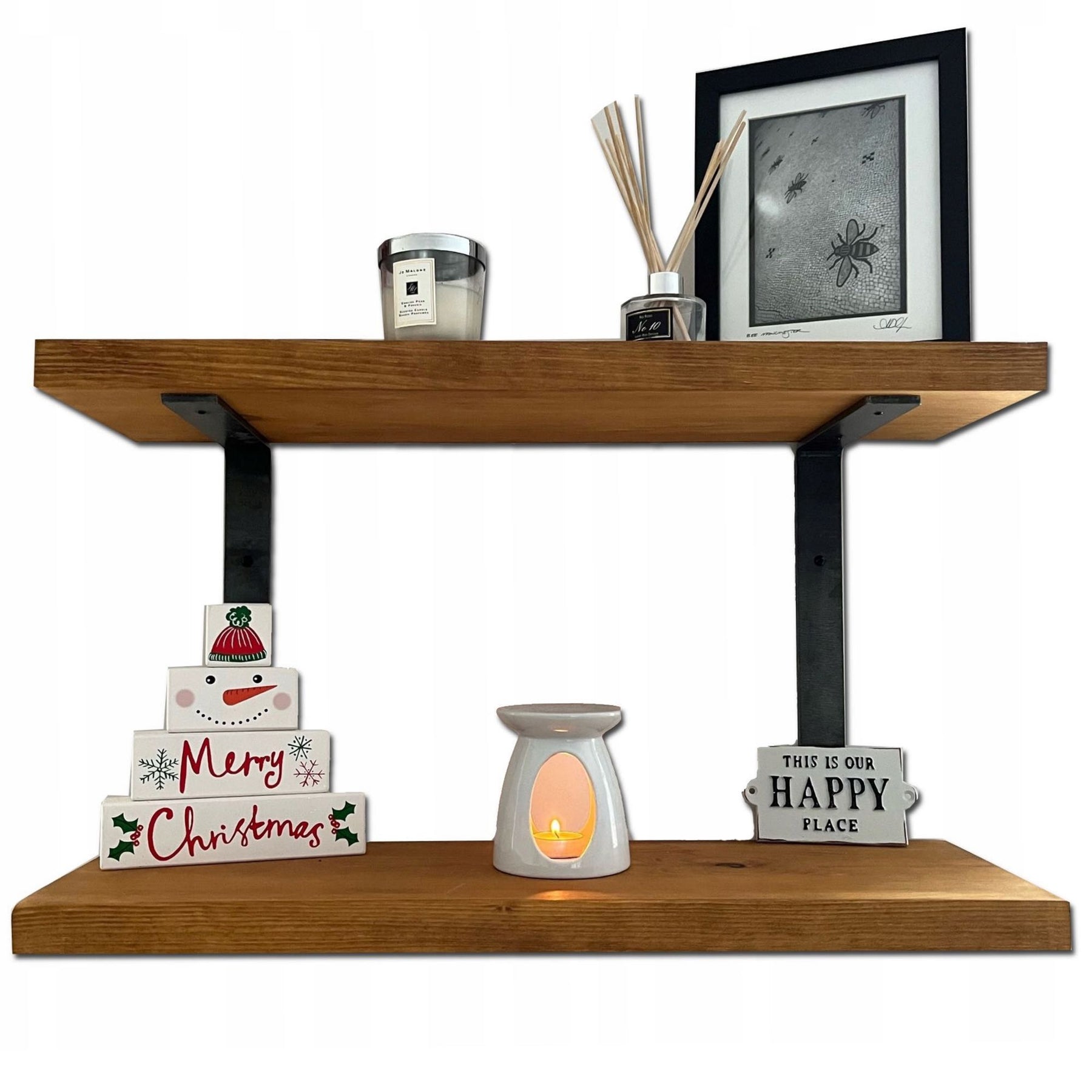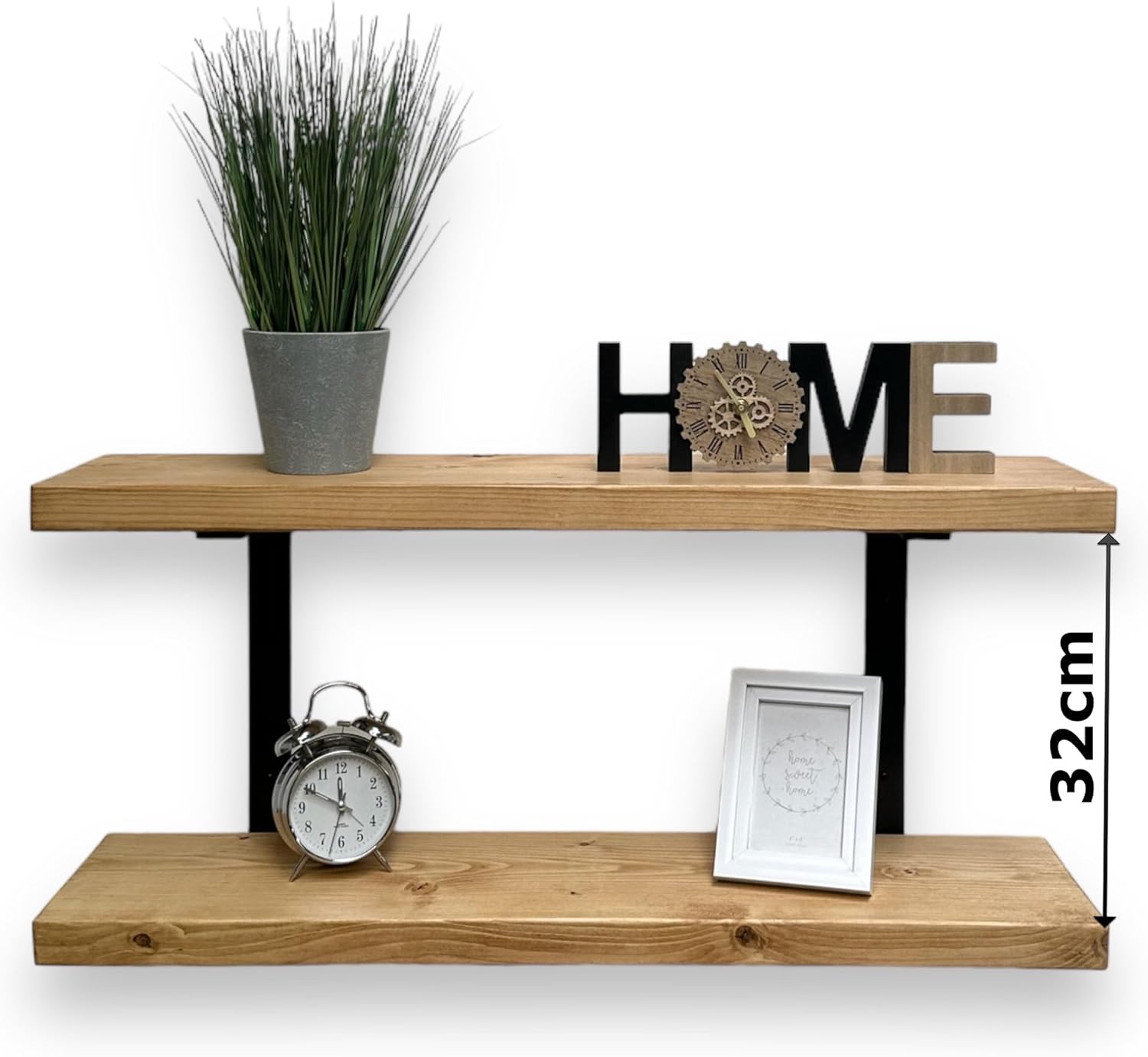 Double Rustic Wooden Shelves Wall-Mounted Shelf with Seated Double Black L Brackets, Solid Timber - Ideal for Kitchen