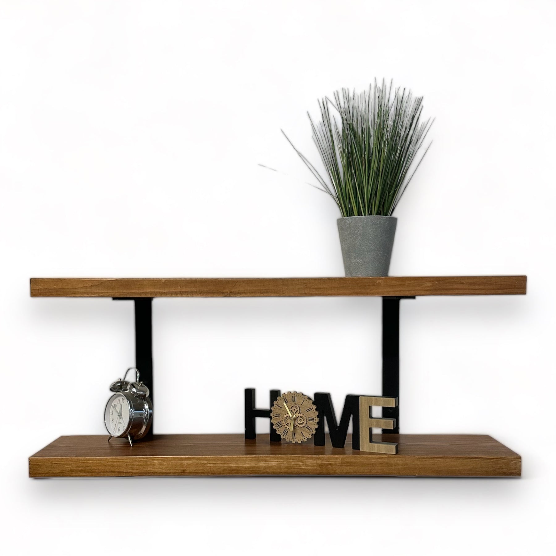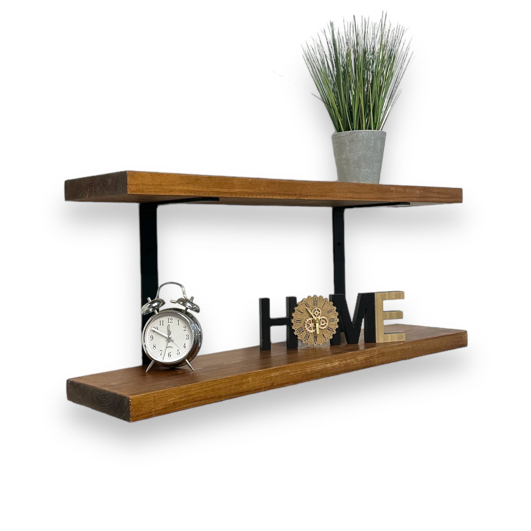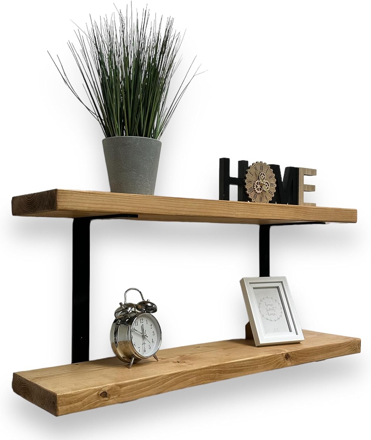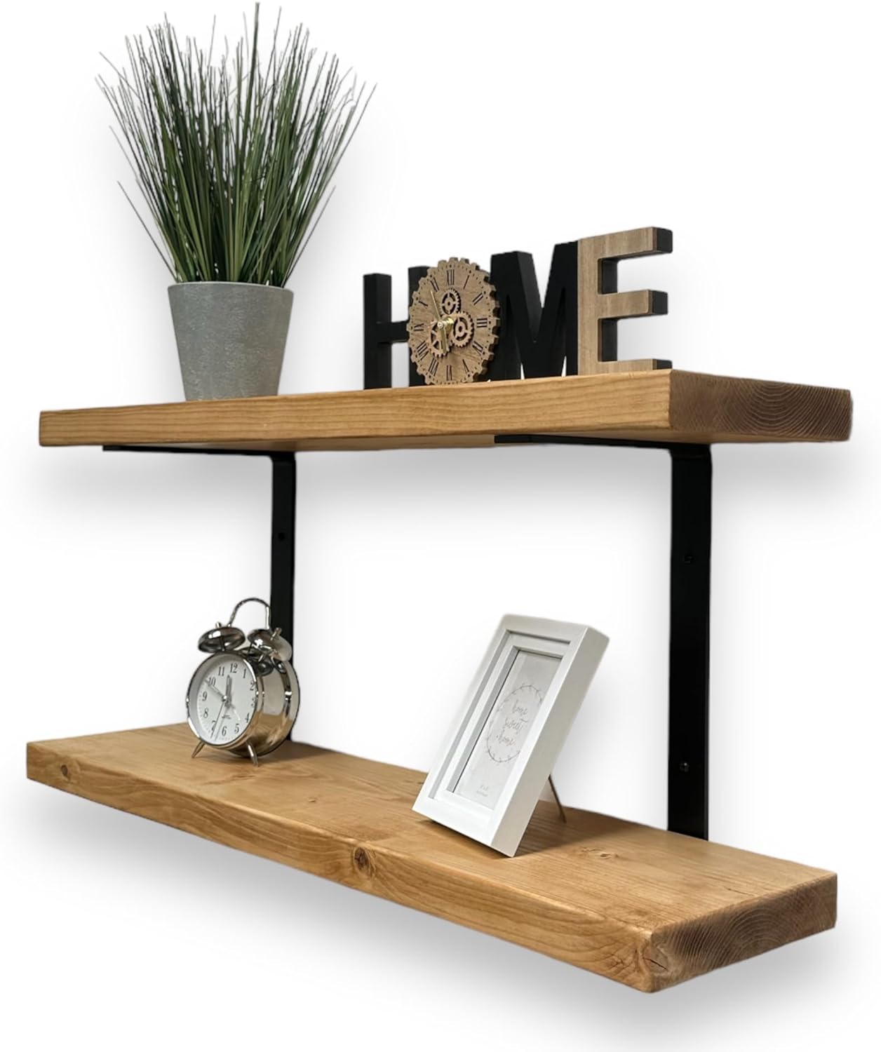 Double Rustic Wooden Shelves Wall-Mounted Shelf with Seated Double Black L Brackets, Solid Timber - Ideal for Kitchen