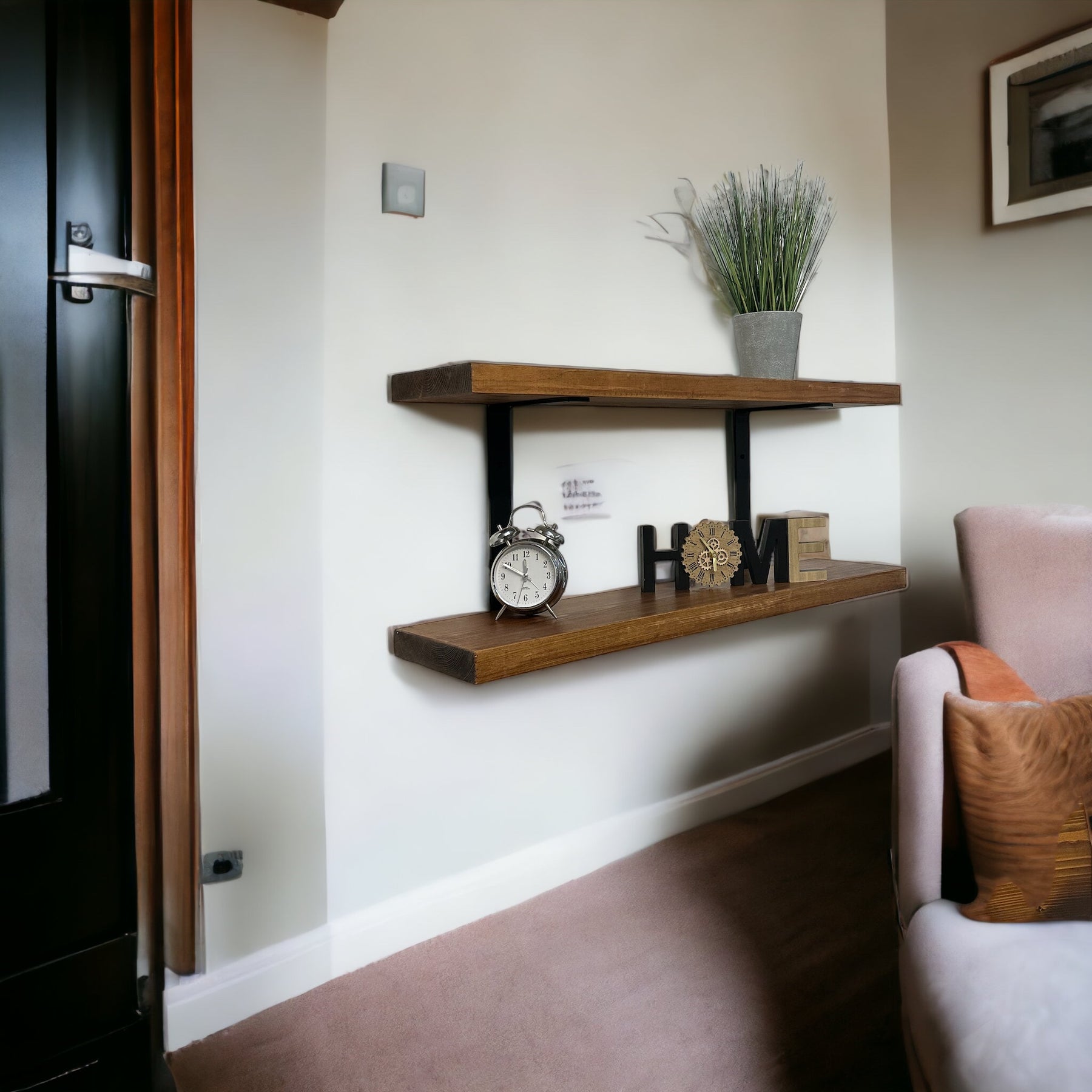 Capture the essence of rustic charm with our solid timber wall shelves, showcased in the first image with a captivating Tudor Oak finish.